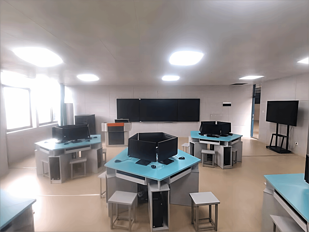 (2)509学前教育虚拟仿真实训室,配有1套智能交互一体机,8套小组显示一体机,1套学前岗前实训虚拟仿真系统,为学前专业的智慧教室。该功能室是为响应高校数字教室和未来教室发展的需求而建,可实现无尘教学,保护师生身体健康,教师可在学生端屏幕上操作电脑,安排特殊任务,学生也可在各自终端电脑上完成指定任务而互不干扰,方便实现师生交互式课堂教学。