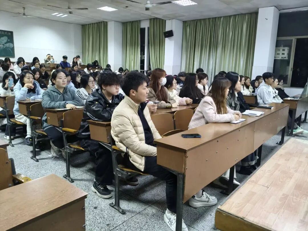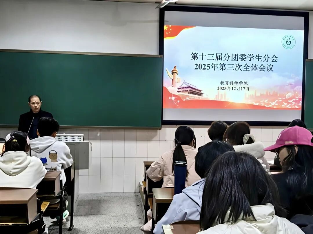 为全面总结本学期团学工作成果,查找不足补短板,凝心聚力做好年底收尾工作,12月17日晚,我院于行知楼302教室成功召开了第十三届分团委学生分会2025年第三次全体会议。本次会议由办公室主任陈雯琪主持,党总支副书记陈界峰、学工办主任邹伶俐以及辅导员老师申鑫玉、吴金煌、单胡杨出席,团学会全体成员、2023-2025级各班班长、团支书以及党支部代表共同参与本次会议。