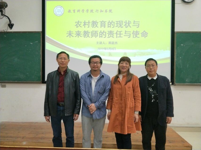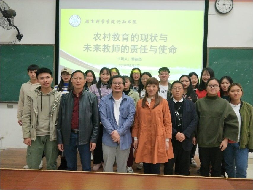 为了提高学生农村教育责任感,使学生热爱乡村教育,5月8日下午2点,我院邀请电影导演蒋能杰就“农村教育的现状与未来教师的责任与使命”在外语楼301教室作农村教师教育讲座,讲座以电影《矮婆》为主线,结合蒋能杰导演的亲身感受,使学生深入了解农村的教育现状。讲座由党总支书记陈君生教授主持,党总支副书记、行知书院院长罗耒英、教育系主任黎利云博士及阳晓艳老师出席了本次讲座。