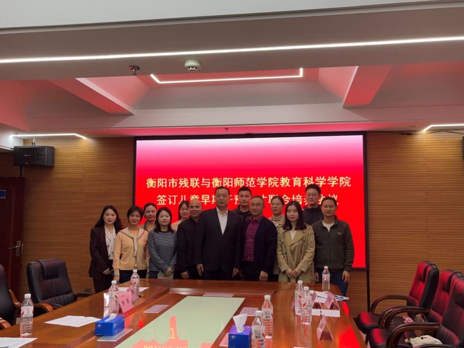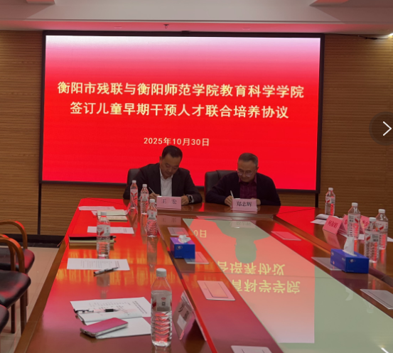 为助力衡阳市残疾人康复服务专业人才培养,推进我院学前教育专业内涵建设,拓宽学前教育专业毕业生就业渠道,10月30日上午,我院与衡阳市残疾人联合会在该联合会中心大类七楼会议室召开联合培养儿童早期干预人才座谈会并签署“儿童早期干预”微专业人才联合培养合作框架协议。院长郑志辉和衡阳市残疾人联合会副理事长王宏参加座谈会并出席签约仪式。