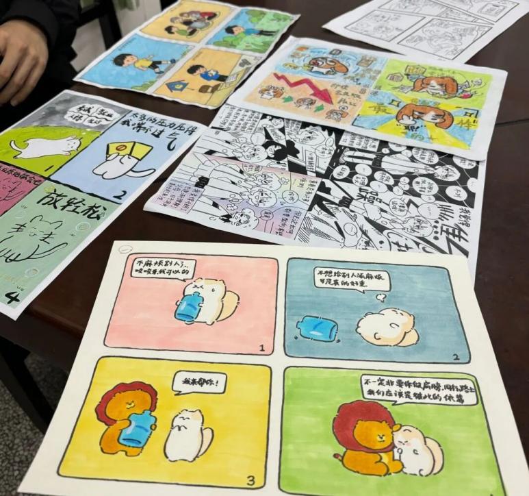 “画漫画的过程,也是梳理自己情绪的过程。”参与团体创作的学生说,他们以“考试焦虑”为主题,把室友互相讲冷笑话缓解压力的日常画进了作品;负责活动的老师表示,作品里“耳机、便签、拥抱”等校园元素,让心理健康教育跳出了说教框架,真正实现了“以学生视角讲学生故事”。
