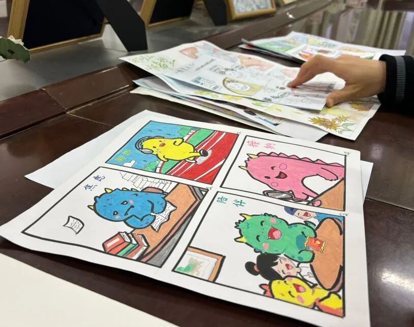 按要求标注宫格顺序,叙事逻辑清晰且创意十足。活动展示现场,色彩斑斓的作品铺满长桌,《与“心”相视而笑》里“皱眉刷 创作中,学生们多元风格尽显巧思:有的用黑白线条营造“深夜emo到晨光自愈”的氛围感,有的以撞色漫画呈现“压力山大到自我和解”的反差感,所有作品均题到画笑脸解压”的细节、《情绪调色盘》中“从灰调抑郁到五彩愉悦”的视觉设计,引得不少学生驻足讨论,“像在漫画里看到了自己的生活”。