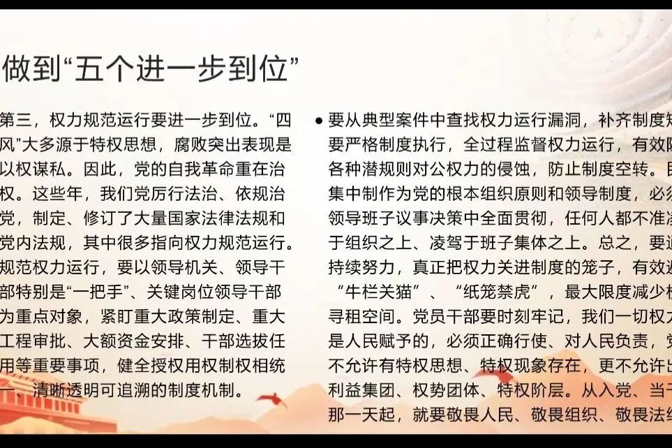 围绕这一核心议题,主讲人结合PPT内容,详细解读了习近平总书记关于党的自我革命的重要论述,重点阐述了必须做到的“五个进一步到位”: