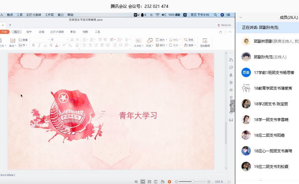 此次会议一共分为三部分。第一部分,由分团委副书记林丽影提到五四青年节当天,团中央将在各大网络平台同步举办“让青春为祖国绽放”网上主题团日活动,并强调我院所有团支部中的团员青年、团干部需通过各线上平台参与网上主题团日活动。要求各班精心组织、收集相关材料并及时报送材料。第二部分,由分团委副书记孙先范讲解我院青年大学习学院团课学习方式以及制度的变化。主要包括四个方面,一是团课学习覆盖率要达100%;二是团课截图有截图变化以及收集截图的时间变化;三是覆盖率未达标会有相应综测惩罚;四是16级各班也要积极参与团课学习。第三部分,由团课注册学习率较高的团支书简单交流自己的想法与方法。各班团支书都表示,通过将要求转发至班级群及寝室长群的方式,让同学们先自主完成学习,再由团支书督促寝室长让未学习的同学尽快学习。各班同学以此方式养成习惯,自主完成团课学习,提高团课注册学习率。