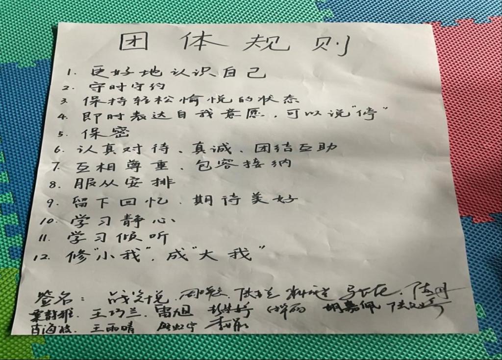 最后进入到“我们的约定”活动环节,尹洁副教授介绍了本次团体干预活动的性质、内容、意义,要求成员写下对团体的期望及在团体中要遵守的规则,举手表决之后约定为团队契约。