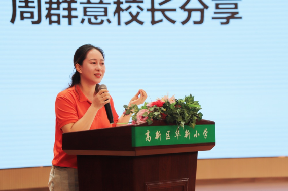 会议伊始,伴随着欢快的旋律,大屏幕上播放起孩子们在校的精彩课堂,大课间的舞动、运动场上的叶问蹲、美术世界的七彩泡泡、防溺水教育的情景剧、规模宏大的校车转运送等,家长们聚精会神地观看着屏幕上那一张张笑脸。紧接着,周群意校长向全体一二年级家长分享华新小学重建这意义非凡的一年。她以“一日、一周、一月、一年”为时间点,深情讲述了华新小学重建过渡期间全体师生、家校携手共进的点滴,其中包含了学校的办学理念、老师们的工作常态、未来教学的发展方向等。周校长坦言,她“一生”的梦想是办一所好学校,培养一批好老师;打造一个好课堂,让孩子们拥有一群好伙伴。与会家长们认真聆听、用心思考,纷纷表示深受感触。
