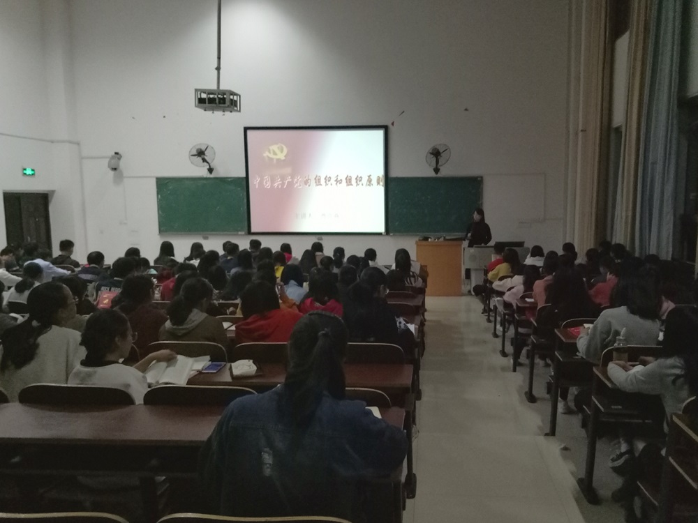 10月31日晚,我院在外语楼北301教室进行入党积极分子培训第三讲,本次培训主题为“党的组织和组织原则”,由辅导员曹喜燕老师主讲。