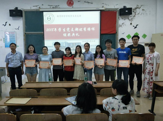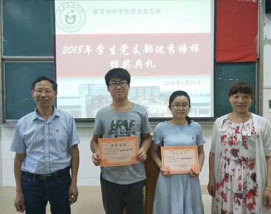 5月24日下午18:50,我院学生党支部在文A307室举行2018年党支部“优秀榜样”颁奖典礼。党总支书记陈君生、党总支副书记罗耒英出席典礼,全体学生党员参加。