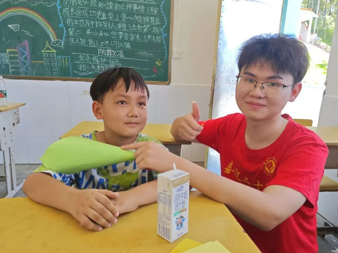 朱雅莉、邓嘉欣等大学生志愿者带着孩子们做艺术团辅活动,例如引导心理绘画,创意手工折纸等等。孩子们在大学生志愿者的陪伴下度过一段快乐而又收获满满的时光。