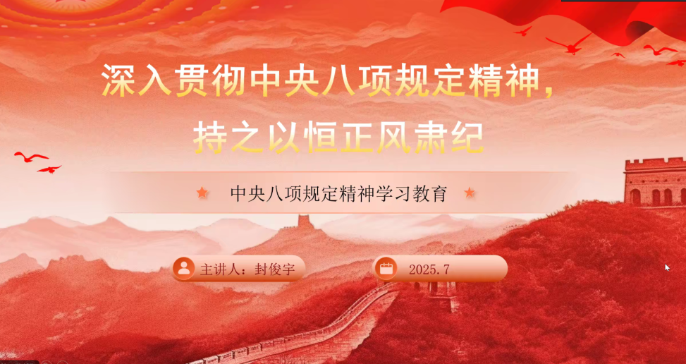 为进一步加强党风廉政建设,深化作风建设,我院党支部于2025年7月26日组织全体党员开展专题党课学习,主题为“深入贯彻中央八项规定精神,持之以恒正风肃纪”。