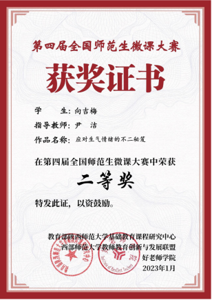 2023年1月4日,从全国师范生微课大赛官方平台传来喜讯,365英国上市集团教育硕士教育管理专业领域2021级研究生向吉梅制作提交的《应对生气情绪的不二秘笈》获二等奖1项,该作品是由尹洁老师精心指导的。