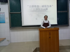 “无诚则无德,无心事难成”。在社会主义文明高度发展、人与人相处难见真情的今天,诚信品质尤为重要。拥有诚信变成了我们每一个大学生所必备的素质。因此我院2017年12月21日晚上7点在文综楼B311举办了“立德修身、诚信为本”的演讲比赛。