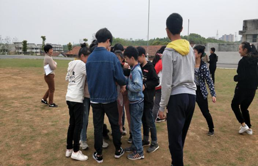 活动前,先召集了学生来到酃湖中学的操场集合,由于操场比较空旷,便于活动开展。总活动一共分为三大部分,首先是热身活动——桃花朵朵开,此活动内容主要是由辅导老师来发布花开的朵数的指令,而同学们则需要根据朵数来围圈蹲下。活动一开始,同学们都比较兴奋,特别是那些成功组队的同学,而那些没有成功组队的同学则显得比较沮丧。不过辅导老师请这些没有成功组队的同学,在大家面前表演了一个小节目作为惩罚,各位同学都比较勇敢又羞涩地表演了节目,尽管如此,却化解了他们沮丧的情绪。桃花朵朵开活动虽然进行的不是热烈,但还是调动起了同学们的积极性,缓解了同学之间比较压抑的气氛。